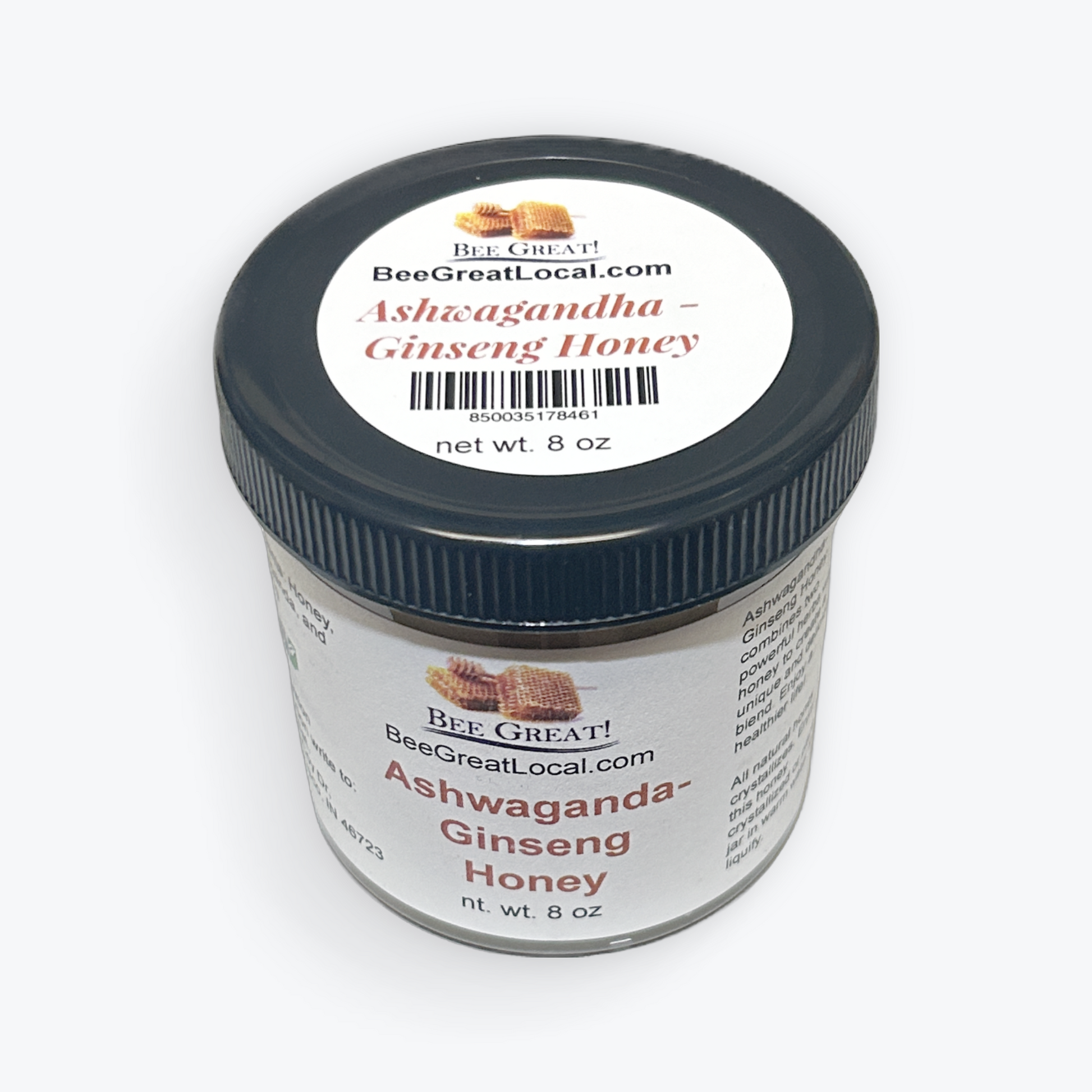 Bee Great Ashwagandha Ginseng Honey combines a powerful adaptogenic herb with honey to create a unique and delicious blend. It comes in an easy to open screw cap jar, and spreads with a knife. This is a clean label product containing only honey and ashwagandha. Ashwagandha is well-known for its ability to reduce stress and anxiety. Enjoy the sweet, earthy flavor and the health benefits of ashwagandha . It has a deep, nutty flavor that can be used to make a delicious Thai peanut dressing for salads or grilled shrimp. It goes great in smoothies. It is delicious on ribs and chicken and makes a fantastic addition to fish tacos.